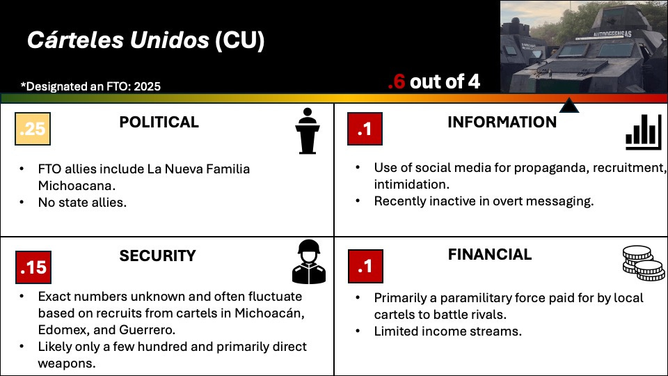 A defensive alliance of local autodefensas, Cárteles Unidos has organized, reorganized, and adapted its resources in direct response to the threat presented by the Cártel del Jalisco Nueva Generación. One possible reason for the designation of Cárteles Unidos is that violence direct at the Jalisco Cartel has been linked to spilling over onto Mexican security forces. This is exemplified by a booby-trap improvised explosive device which killed two soldiers and wounded five others in Michoacán in December 2024. As illustrated in this figure, Cárteles Unidos influence is fairly low, due primarily because of its existence solely as an armed organization. It is rated as .6 out of 4 possible.